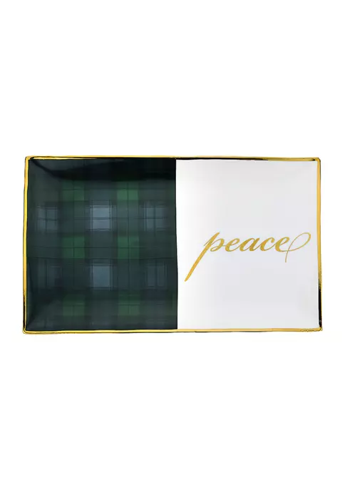 This navy & green tartan plaid “Peace” small rectangular tray from Bazaar is crafted out of sleek porcelain for a touch of sophistication.