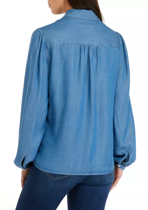 Hitting at the hip, this shirt from Biltmore® features balloon sleeves with a slight puff at the shoulders and a full button-down with a covered placket.