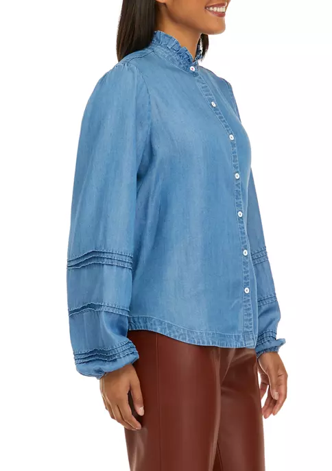 Draw the line between masculine and feminine with this button-down shirt with a ruffle neck and long blouson sleeves from Biltmore®.